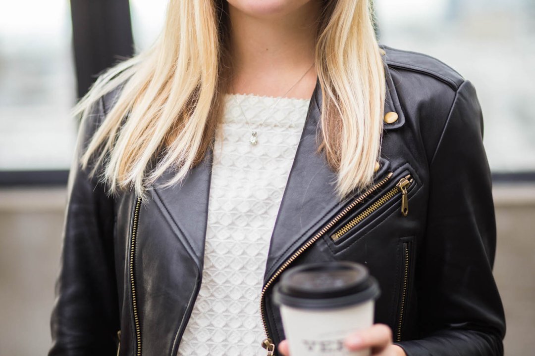 While traveling for work in LA, I paired one of my favorite dresses with a leather jacket and the perfect JTV.com pieces for a seasonal look {at least by LA standards since the weather is always 65 and sunny most of the year!}. I stayed at a hotel and spent a good amount of time working and drinking lots of coffee on their roof, but even though I was traveling I still wanted to glitz things up my look {it was LA after all…} with earrings, a necklace and tennis bracelet from JTV.com.