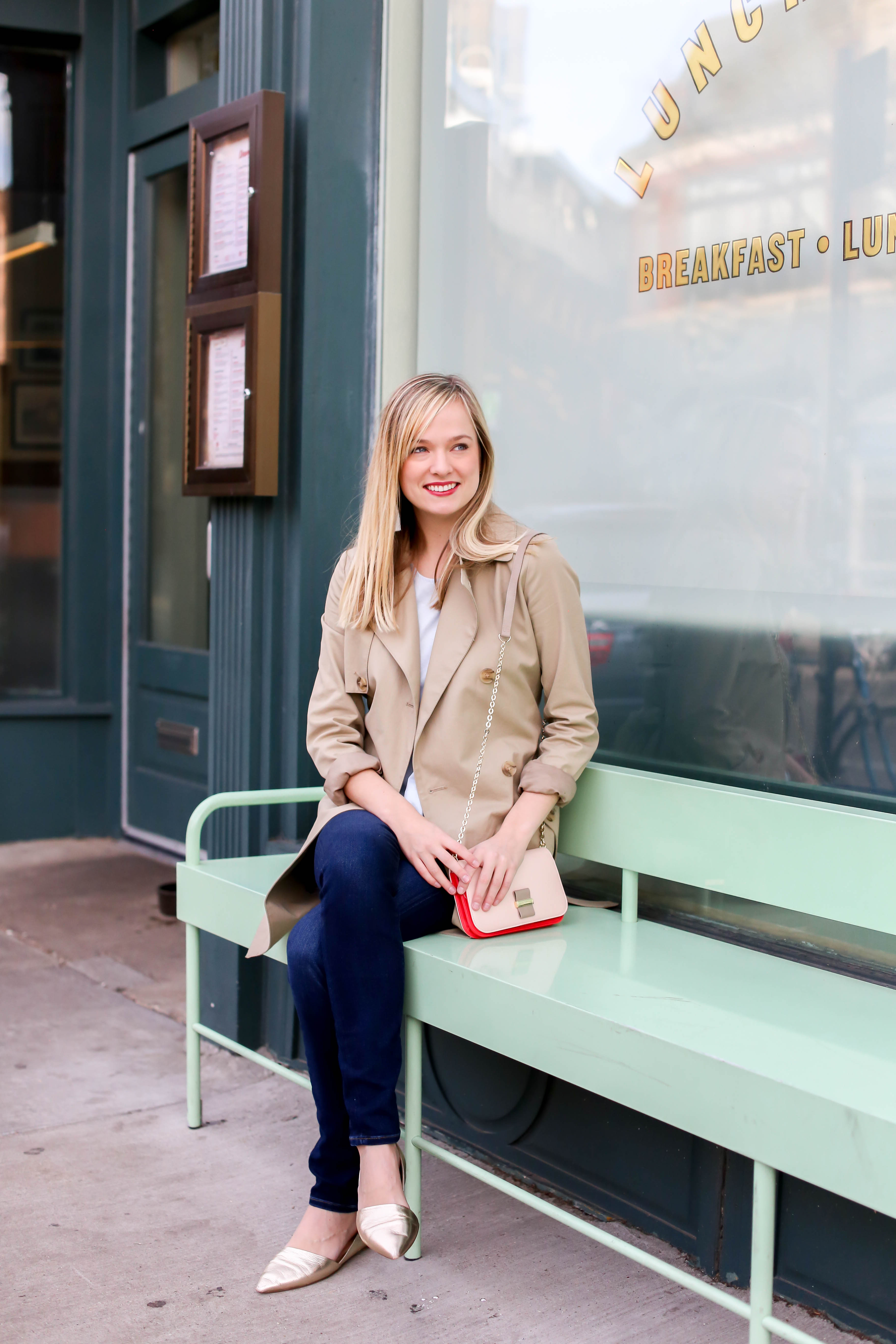 Trench Coat {similar that’s adorable and affordable here!}// Jeans {a steal from Marshall’s} // Earrings from Nakamol Chicago // Gold Flats {originally from J.Crew, but I love these here, here and here} // Chloe Purse …